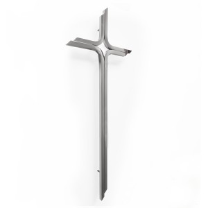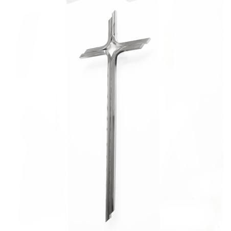 Krzyż wykonany z blachy nierdzewnej w dwukolorowym wykończeniu. Wiszący z zamontowanymi kołkami do montażu.
