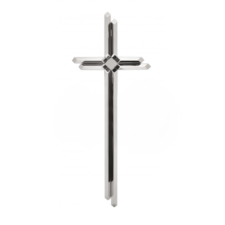 Krzyż wykonany z blachy nierdzewnej w dwukolorowym wykończeniu. Wiszący z zamontowanymi kołkami do montażu.