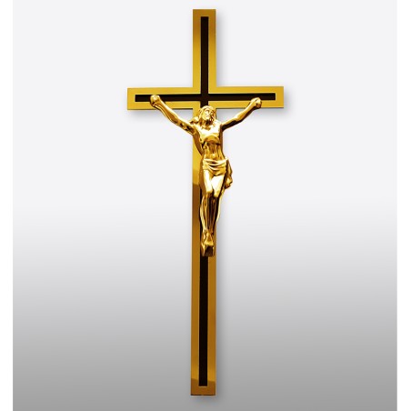 Krzyż z pasyjką wykonany z blachy nierdzewnej w dwukolorowym wykończeniu. Wiszący z zamontowanymi kołkami do montażu.