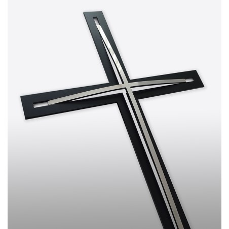 Krzyż wykonany z blachy nierdzewnej w dwukolorowym wykończeniu. Wiszący z zamontowanymi kołkami do montażu.
