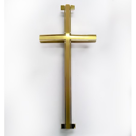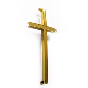 Krzyż wykonany z blachy nierdzewnej w dwukolorowym wykończeniu. Wiszący z zamontowanymi kołkami do montażu.