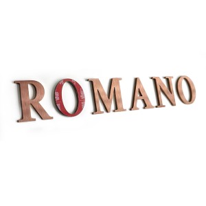 Litery i cyfry ze stali nierdzewnej szlifowanej, metalizowane na kolor miedziany.